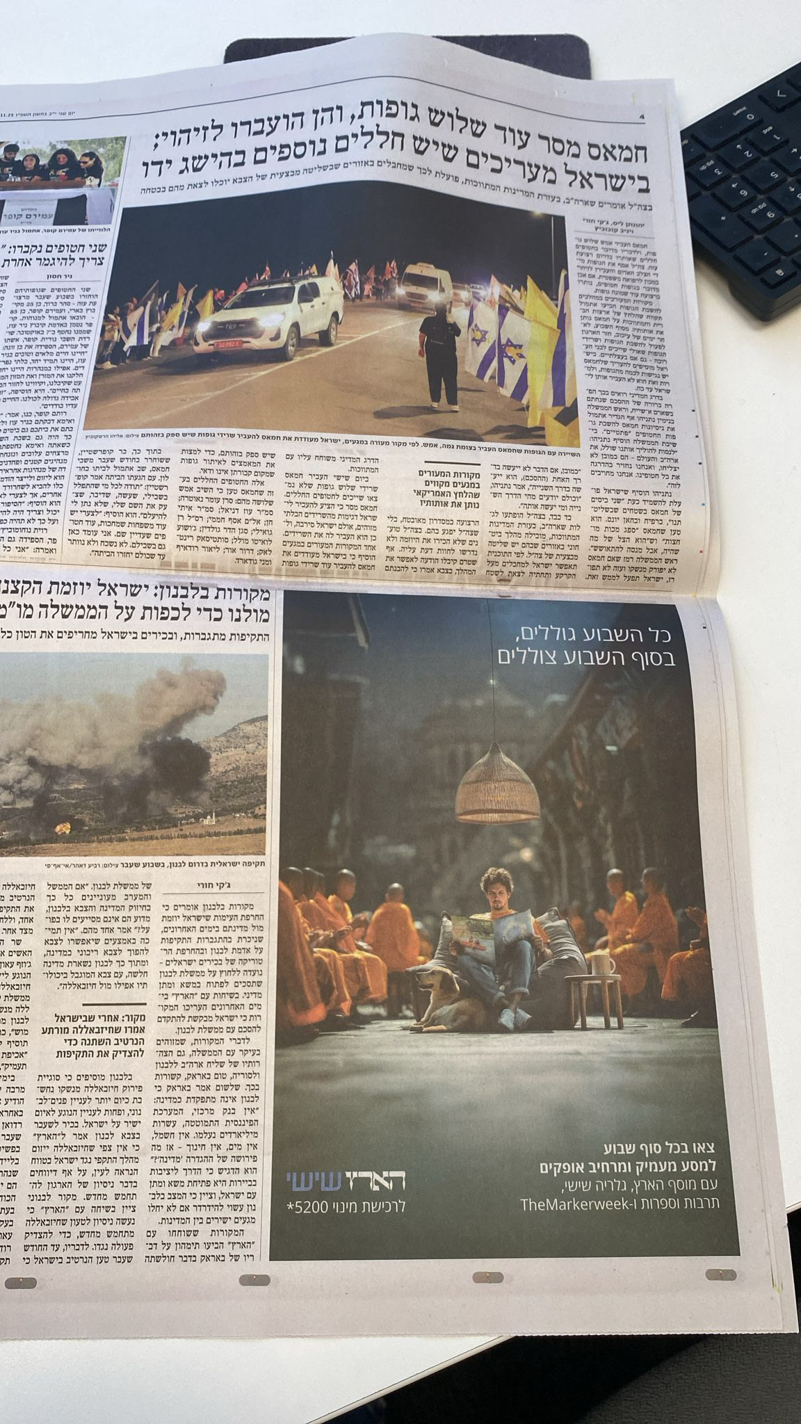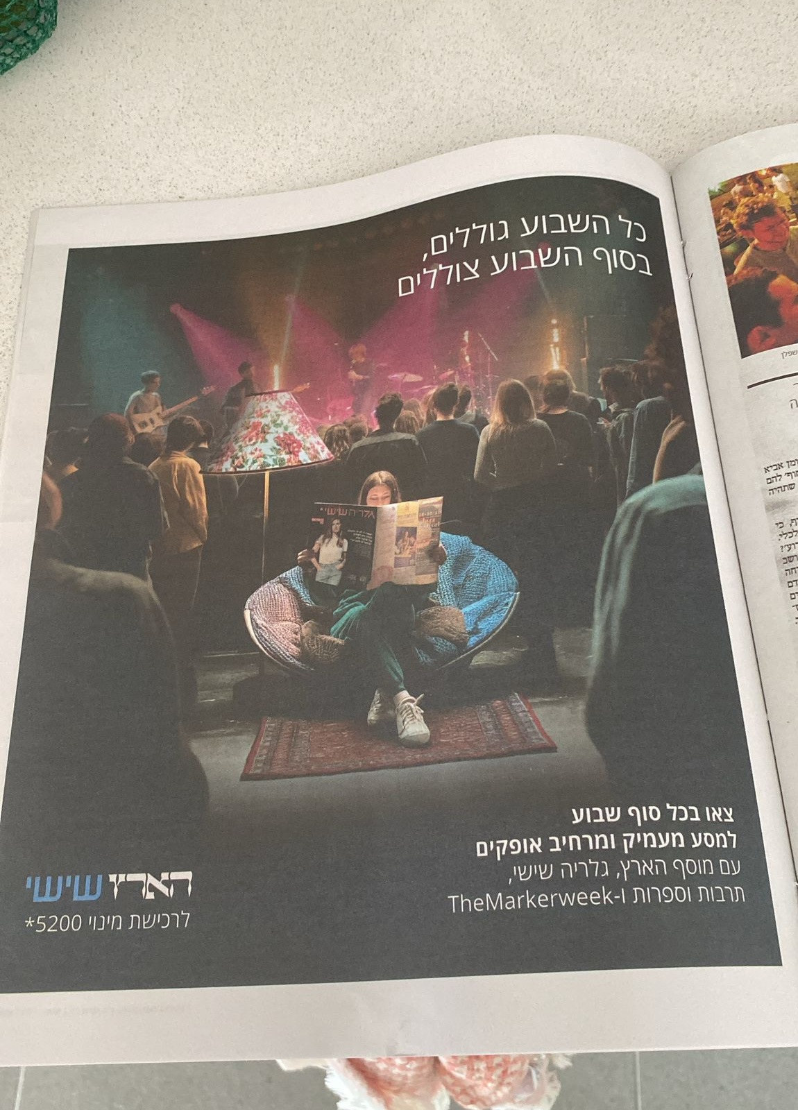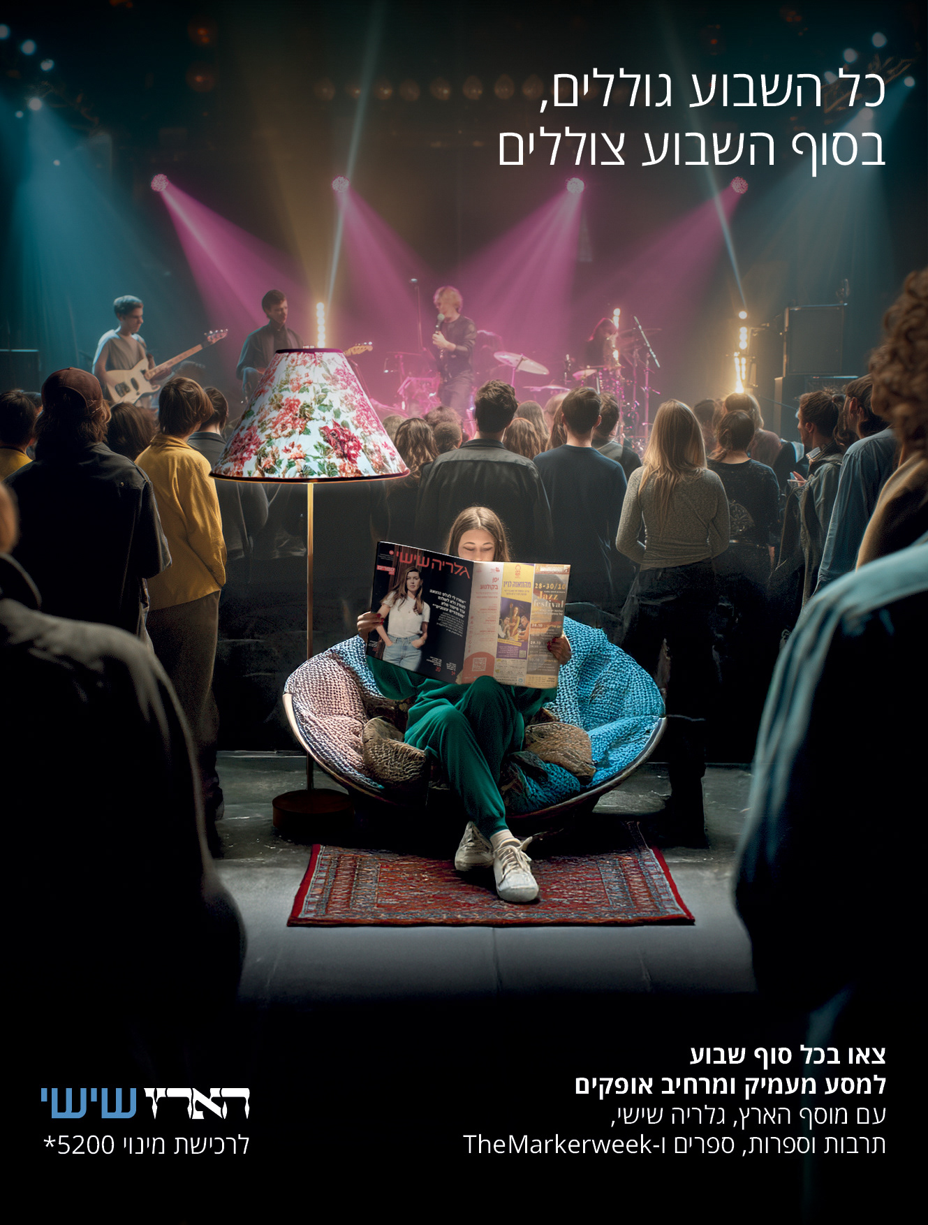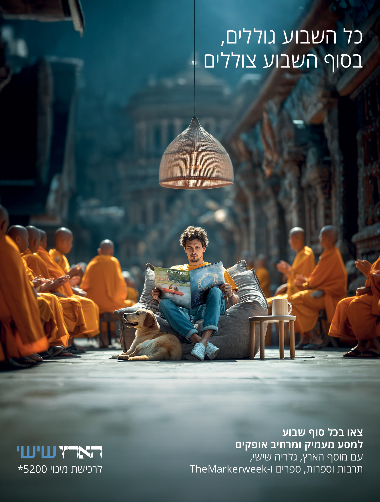 Visuals present calm, surreal environments representing a mental shift while engaging with Haaretz Friday and its supplements.